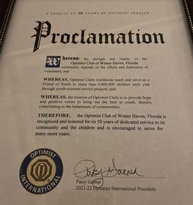 City of W.H. and Optimist International proclamations recognizing the Club's 50 years of service to youth and the community.